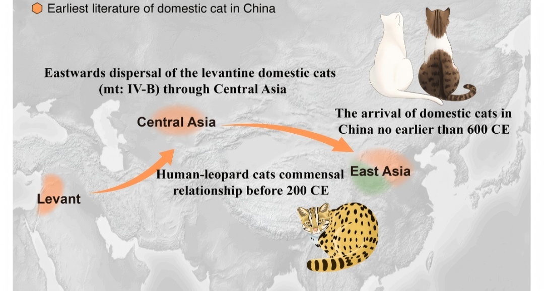 团队通过基因数据,绘制了一张清晰的迁徙地图。比对欧亚大陆古今猫的基因组,研究者发现,它与来自中亚哈萨克斯坦占肯特遗址、年代相近的古代家猫遗传关系最近。