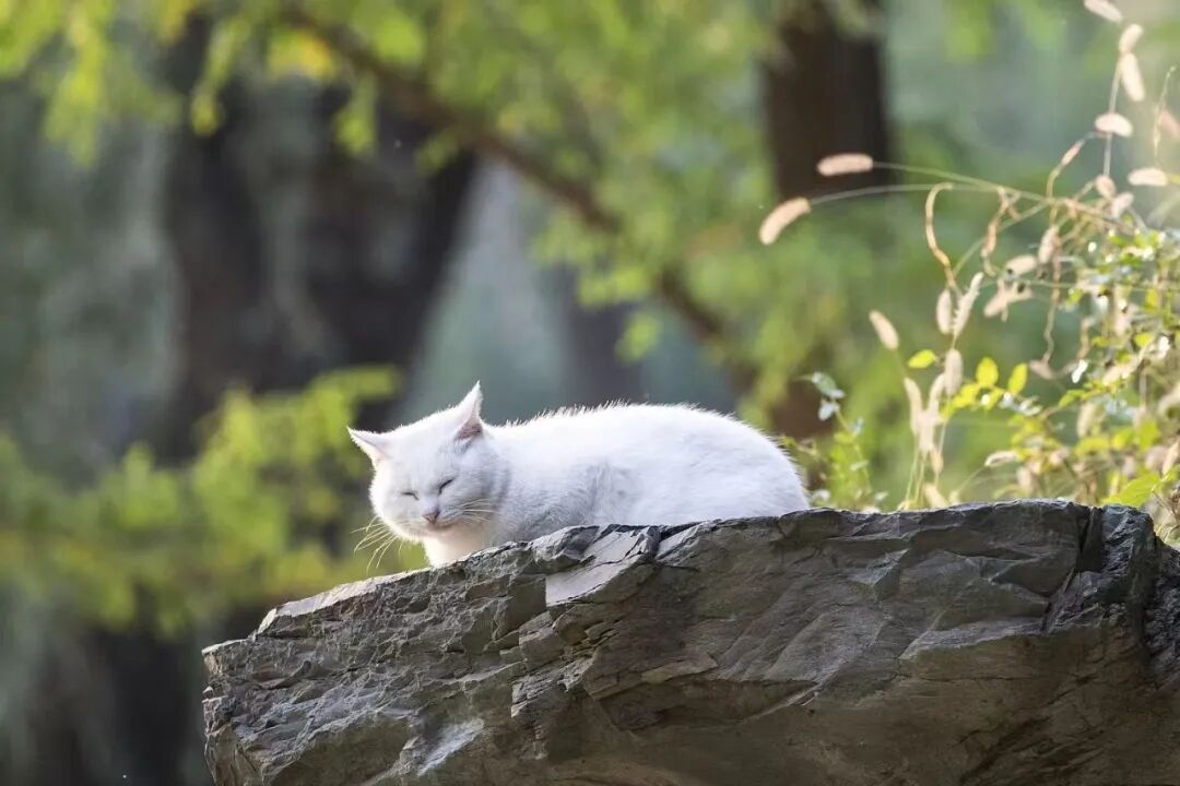 北京圆明园遗址公园里,一只白色的猫咪在阳光下小憩。图|视觉中国