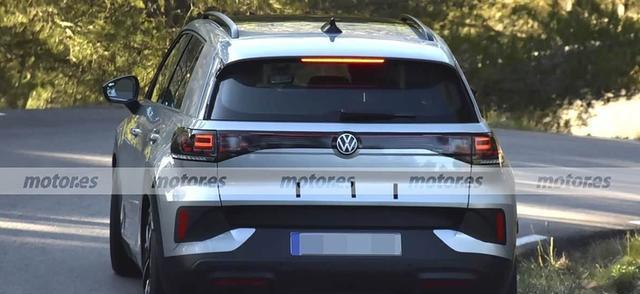 转到车身侧面,悬浮式车顶的样式比较显眼,轮廓显得紧凑,搭配了尺寸不小的轮圈,门把手则是传统设计,没有采用隐藏式。车尾部分,尾灯也做了伪装处理,不过从翘边的贴纸能看出,它很可能也是贯穿式造型,后包围的样式则强调了一些跨界属性,让整车多了点运动感。